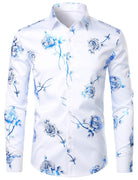 Men's Casual Blue Rose Floral Print Button Up Long Sleeve Dress Shirt