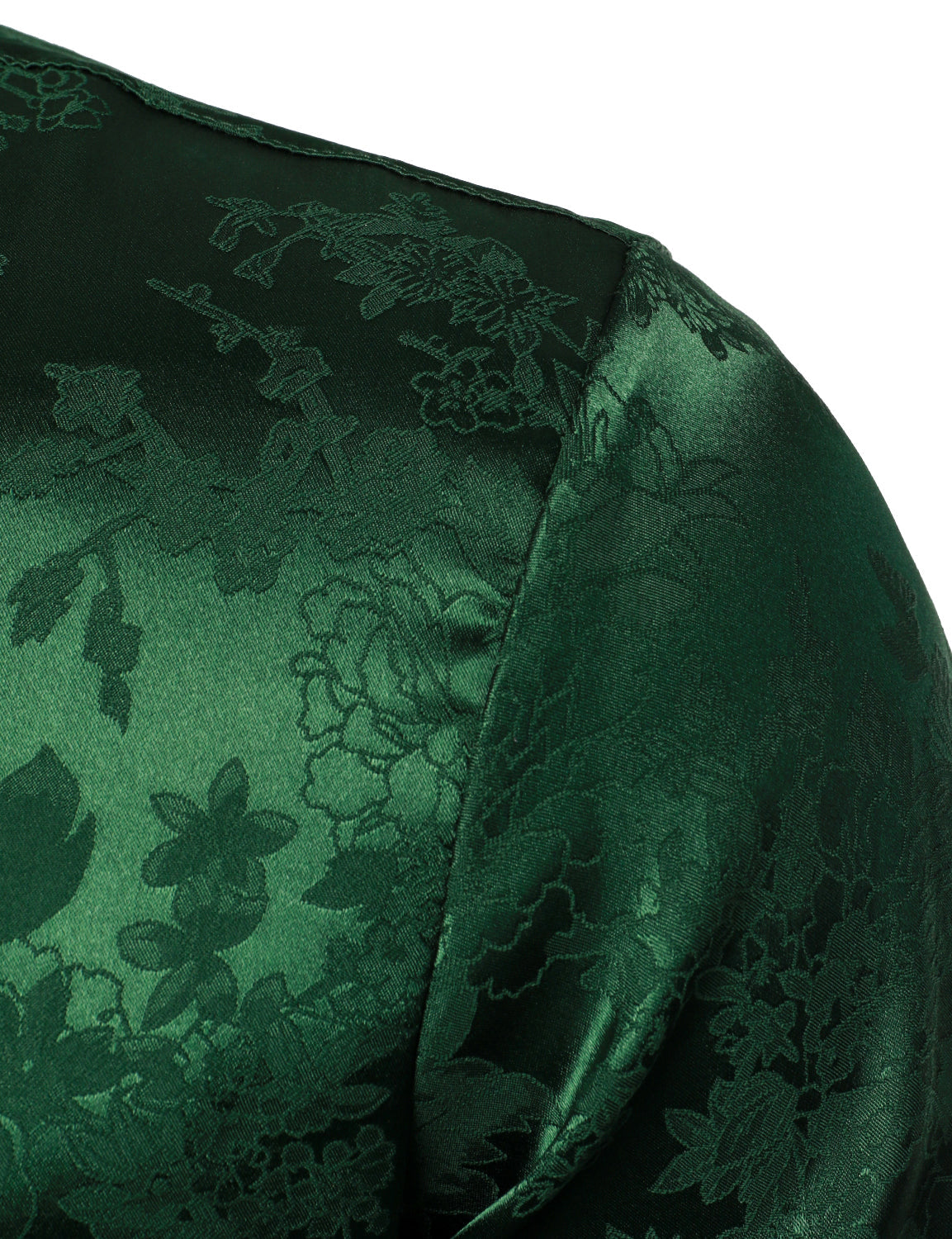 Men's Casual Shiny Satin Floral Jacquard Green Long Sleeve Button Up Dress Shirt